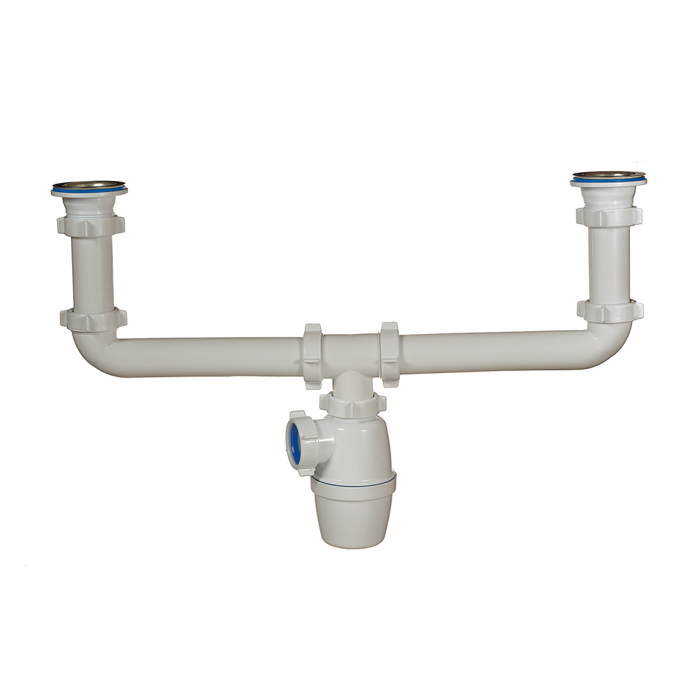 Сифон с большим корпусом и отстойником для двойной одноуровневой или двухуровневой мойки, с выпусками с нержавеющими чашками д.70мм. Необходим отвод в канализацию.
