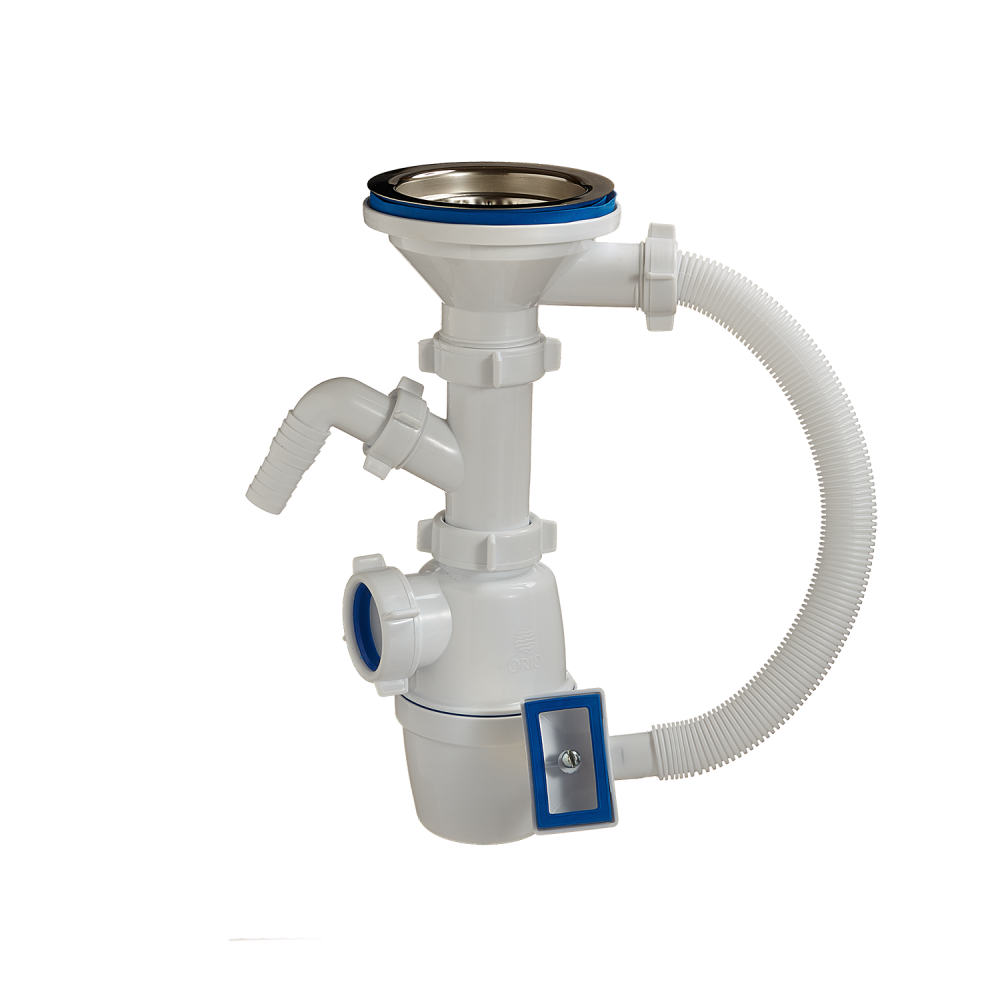 Сифон с большим корпусом и отстойником, выпуском с нержавеющей чашкой д.114мм и отводом для слива от стиральной машины, для мойки с прямоугольным переливом. В комплекте идут две прокладки на перелив – прямоугольная на квадратную форму мойки и полукруглая на круглую форму мойки. Необходим отвод в канализацию.