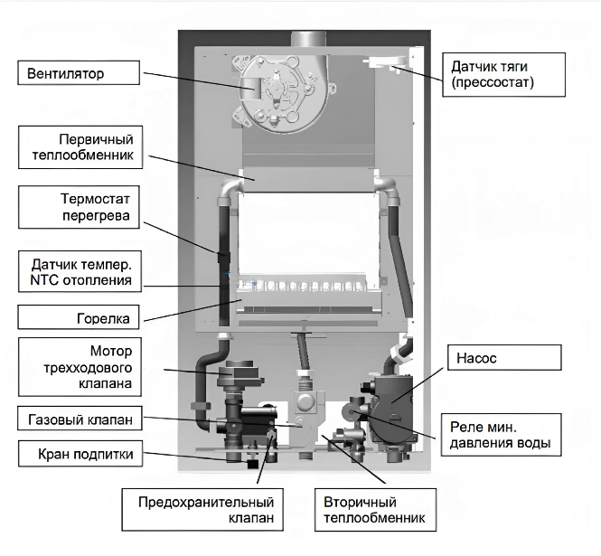 - Система двух раздельных теплообменников: Первичный выполнен из высококачественной меди с антикоррозийным покрытием, а вторичный (для ГВС) — из нержавеющей стали, что гарантирует быстрый нагрев воды и долгий срок службы.