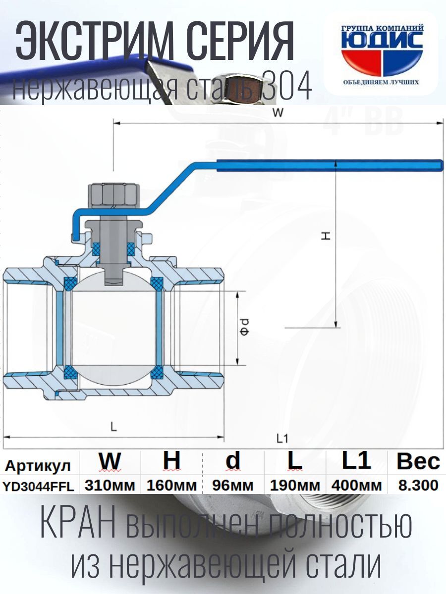 Кран шаровой ВВ 4" ГК ЮДИС - это отличный выбор для тех, кто ищет надежный и долговечный кран. Этот кран изготовлен из нержавеющей стали, что обеспечивает ему высокую прочность и устойчивость к коррозии. Он имеет муфтовое подключение BР/HР, которое позволяет легко установить его на трубе без использования дополнительных инструментов.