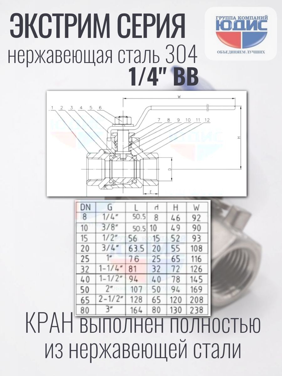 Описание товара: Кран шаровой 1/4" из нержавеющей стали (нержавейка) ЮДИС