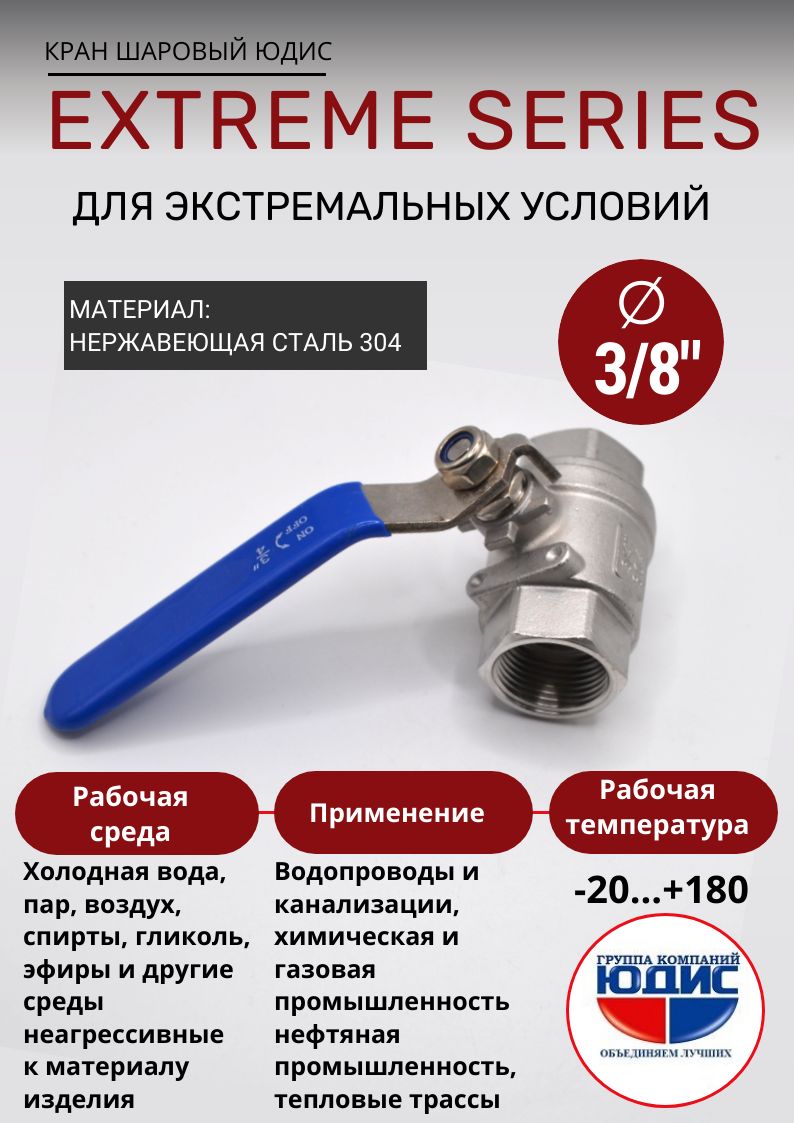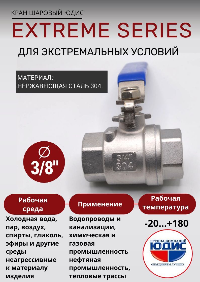 Описание товара: Кран шаровой для воды 3/8" ВВ нержавейка (нержавеющая сталь) ЮДИС