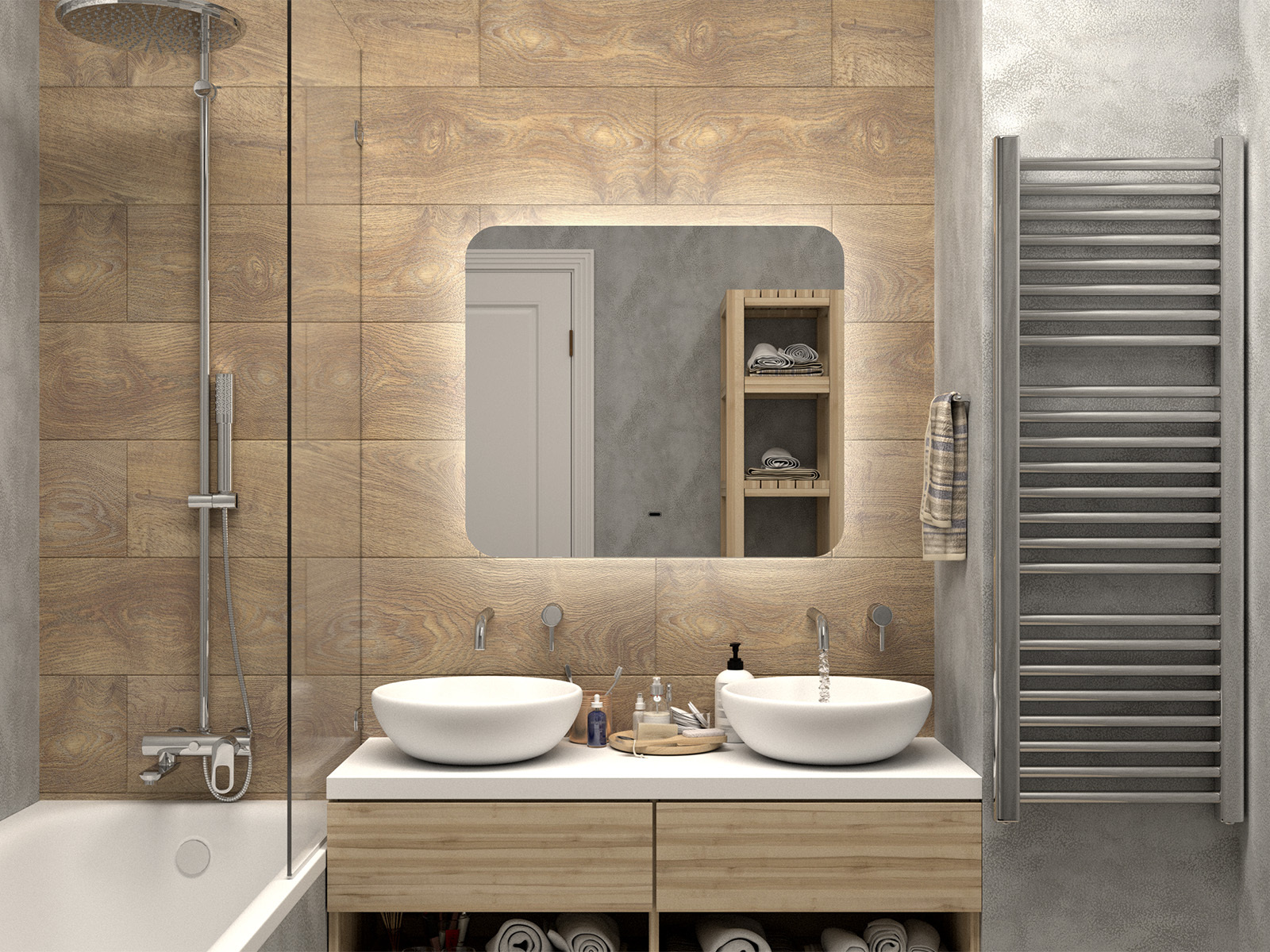 подогрев зеркала (антизапотевание), подсветка, регулировка яркости подсветки, сенсорный выключатель на зеркале, бесконтактный сенсор